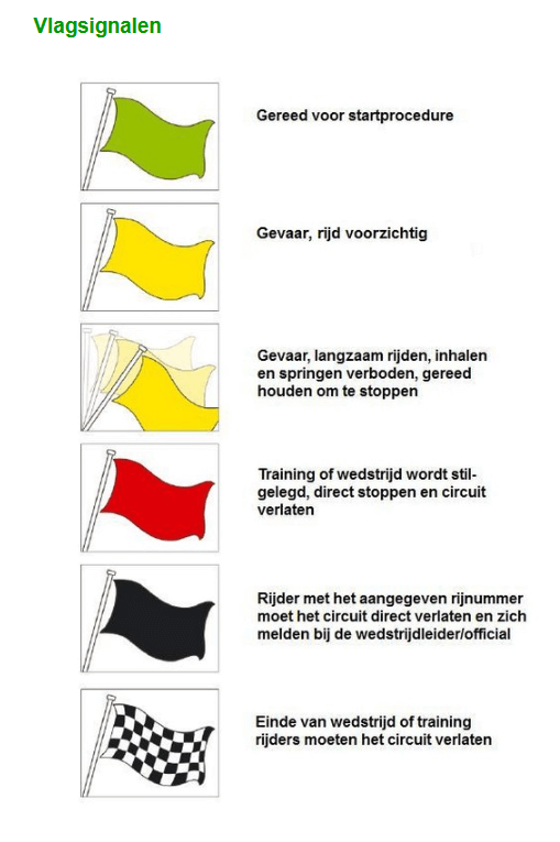 Er zitten altijd 2 klassen tussen het vlaggen en het rijden in. Na het einde van een klasse blijft de vlaggenist staan tot je afgewisseld wordt door de volgende vlaggenist (dit in verband met de veiligheid en een snelle doorstroming van de wedstrijd)